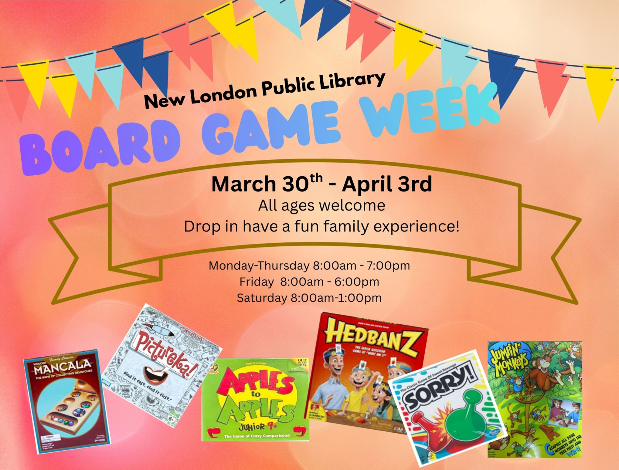 Board Game Week Drop in and have a fun family experience. All ages welcome. + Add to Google Calendar + iCal / Outlook export 00 days 00 hours 00 minutes 00 seconds Date Mar 30 2026 - Apr 03 2026 Time 8:00 am - 6:00 pm Category Adults All Ages Kids Teens Share this event
