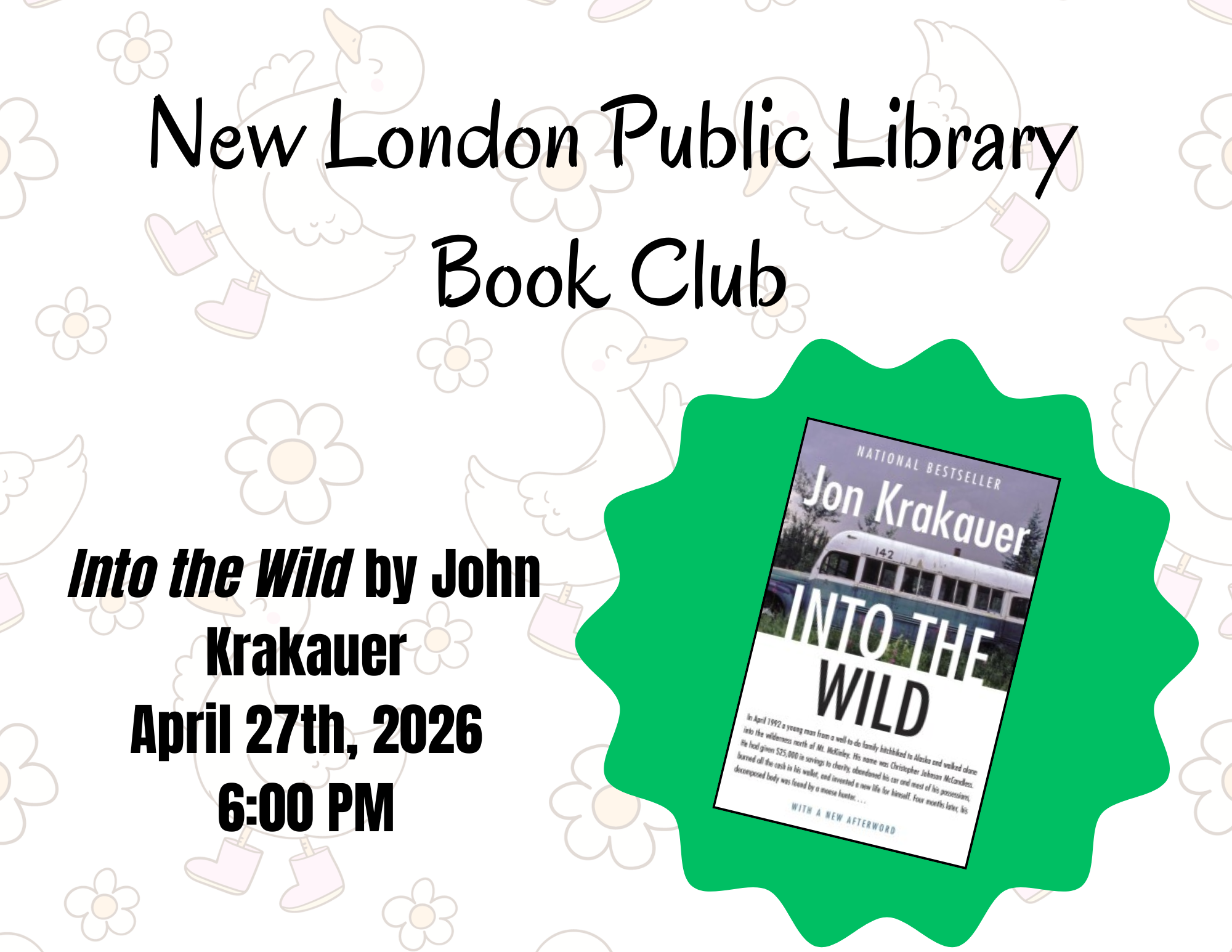 Book Club Into the Wild by John Krakauer April 27th, 2026 6:00 PM + Add to Google Calendar + iCal / Outlook export 00 days 00 hours 00 minutes 00 seconds Date Apr 27 2026 Time 6:00 pm - 7:00 pm Category Adults Share this event