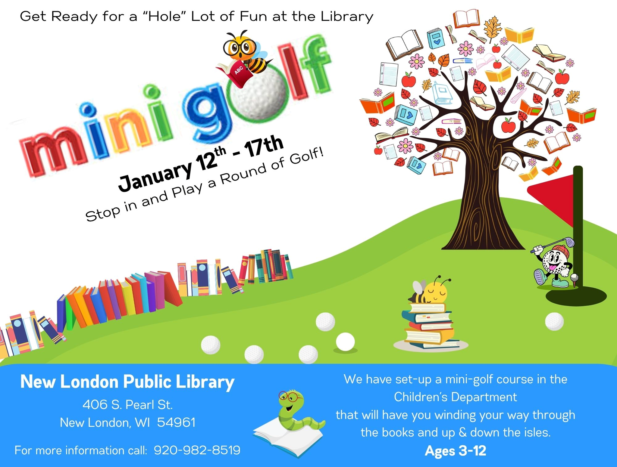 We have set-up a mini-golf course in the Children’s Department that will have you winding your way through the books and up & down the isles.  Ages 3-12.  For more information call 920-982-8519.
