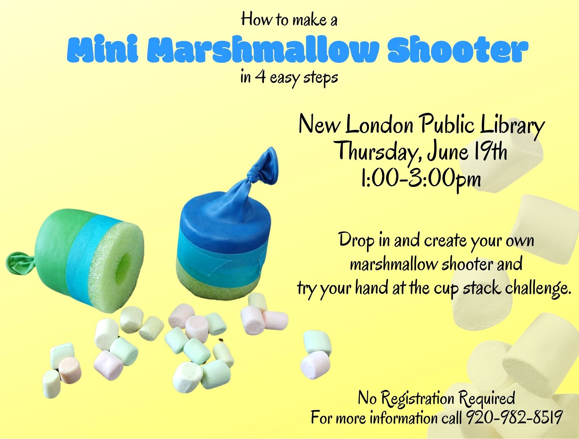 Drop in and create your own marshmallow shooter and try your hand at the cup stack challenge.  No Registration Required.