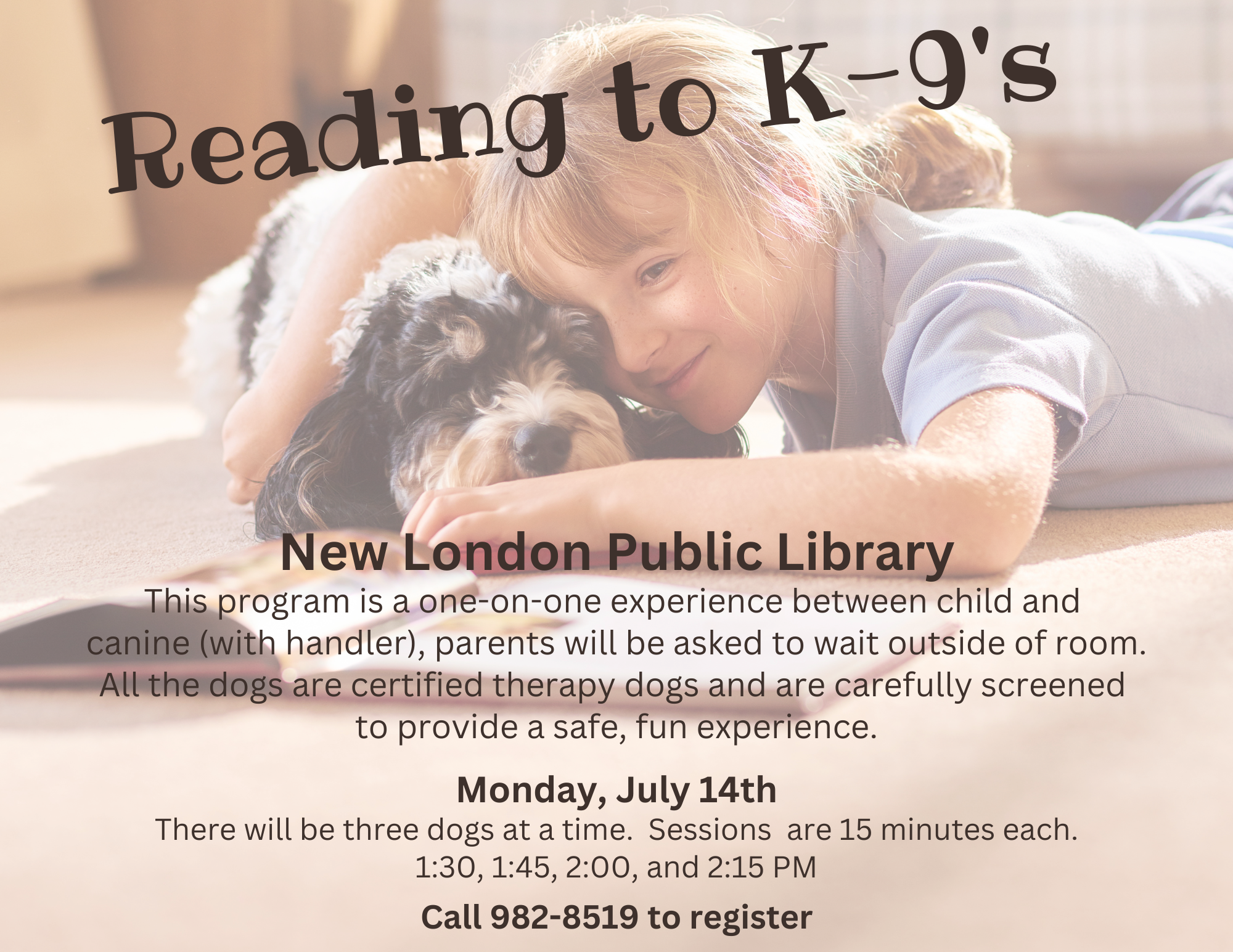 This program is a one-on-one experience between child and canine (with handler), parents will be asked to wait outside of room.