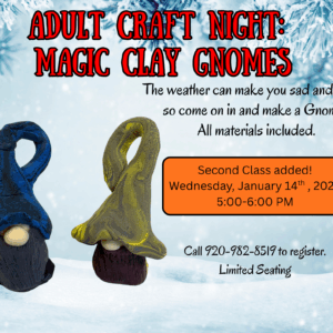 The weather can make you sad and alone, so come on in and make a Gnome! All materials included. New London Public Library Thursday, January 8th, 2026 5:00-6:30 PM Call 920-982-8519 to register. Limited Seating