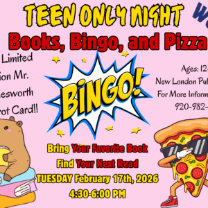 Bring Your Favorite Book Find Your Next Read Tuesday, February 17th, 2026 4:30-6:00 PM Win a Limited Edition Mr. Charlesworth Brainrot Card!! Ages: 12-18 New London Public Library For More Information, Call: 920-982-8519